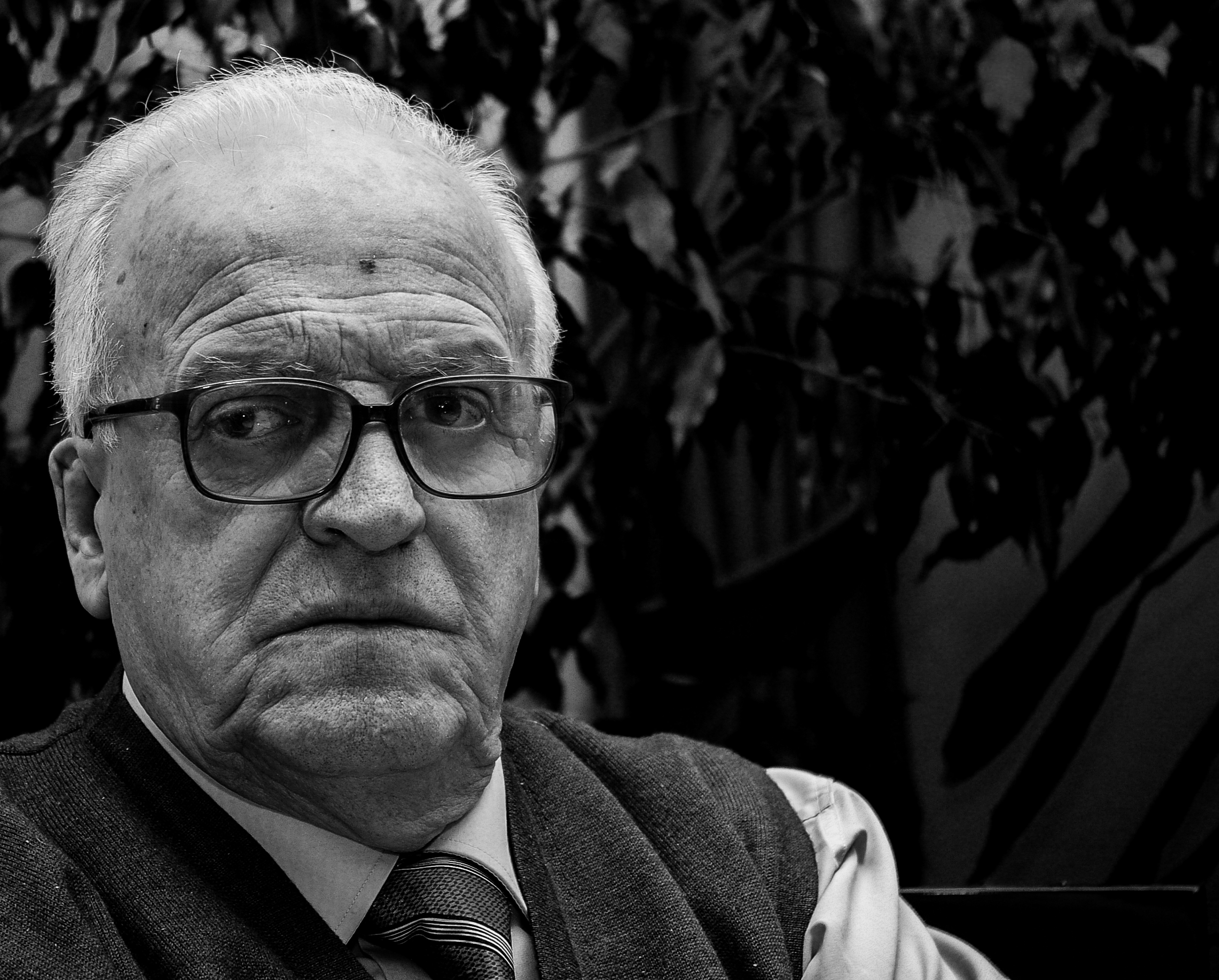 Un hombre con tanta experiencia como años nos muestra expresión reflexiva, mientras nos observa en silencio, envuelto en un ambiente sobrio con hojas desenfocadas de fondo que aportan un aire introspectivo