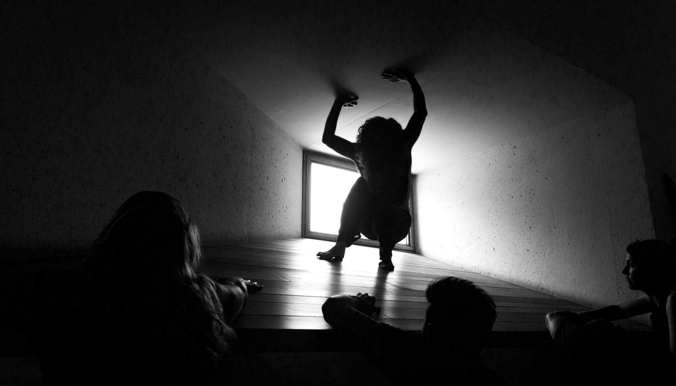 Una figura enigmática se encuentra en cuclillas, iluminada dramáticamente por una ventana que contrasta con las sombras, mientras observadores en penumbra parecen intrigados o cautelosos por su presencia.