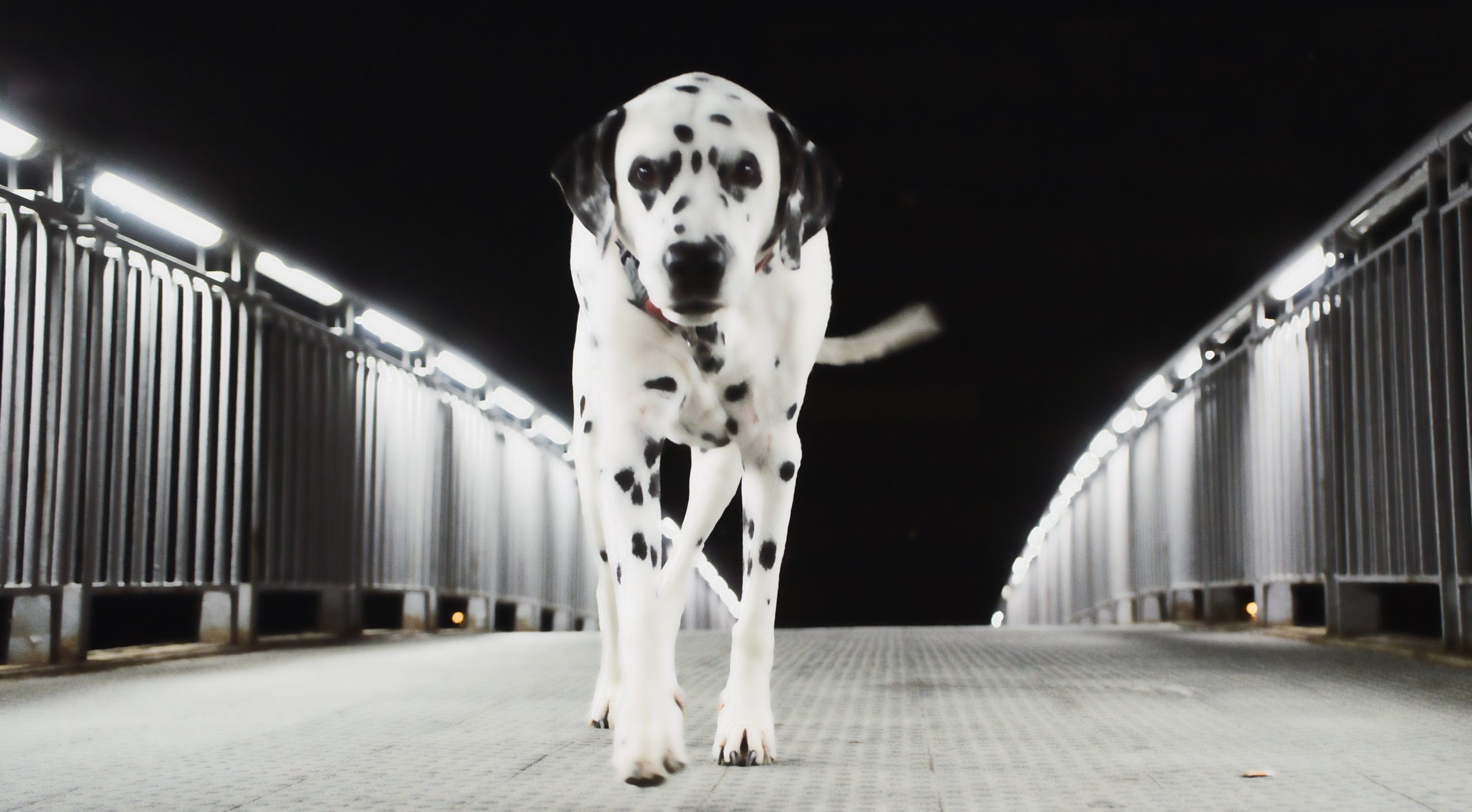 Fray necesita, a sus diez años y medio, salir de noche antes de dormirse a hacer su necesidades; ya no aguanta toda la noche del tirón. Esa noche nos acercamos a la Pasarela, atraídos por su luz, como nocturnos insectos voladores. Me detuve al comienzo de la Pasarela. Sabía que subiría hasta el punto más alto, miraría hacia atrás, me vería esperándole y volvería. Ese día llevaba la cámara. Me agacho a su altura y, cuando estaba a unos metros, disparo cámara. Fray camina despacio, la artritis es su otra amante inoportuna. Me vinieron a la mente los nombres de tres mujeres, quizá cuatro.