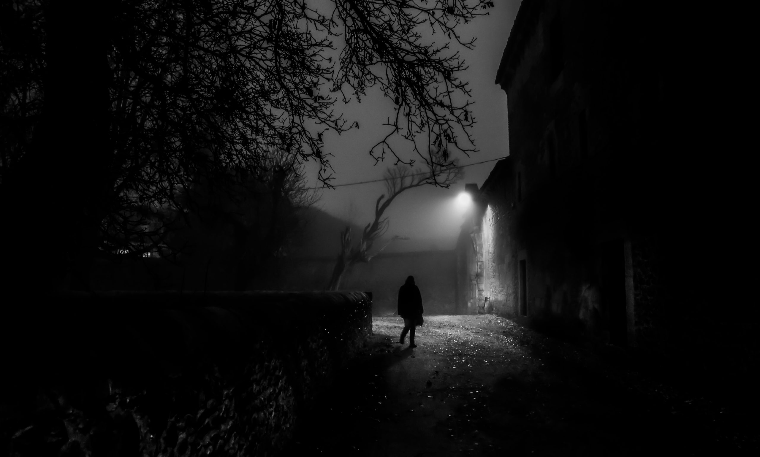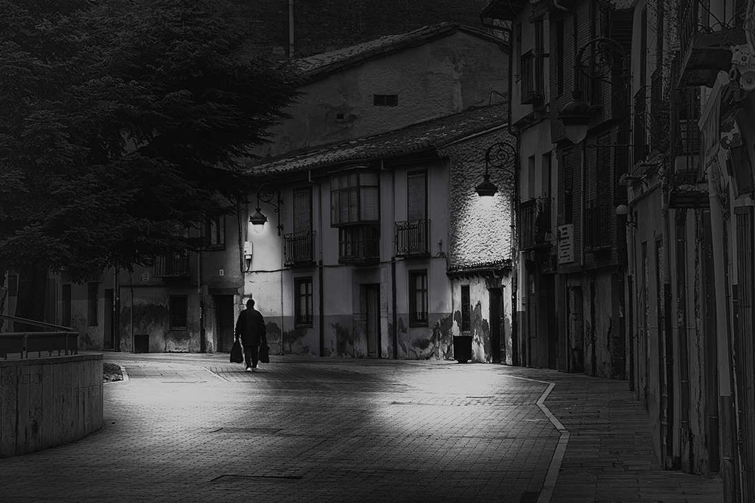 La luz de las farolas antiguas perfora la oscuridad, dibujando pequeños círculos luminosos en el suelo, como si ofrecieran refugios temporales, momentos donde uno podría detenerse y escapar de las sombras. Pero yo, como Ripley, elijo seguir caminando por el filo de la penumbra siguiendo a esa figura que parece pertenecer más a las sombras que a la luz .
