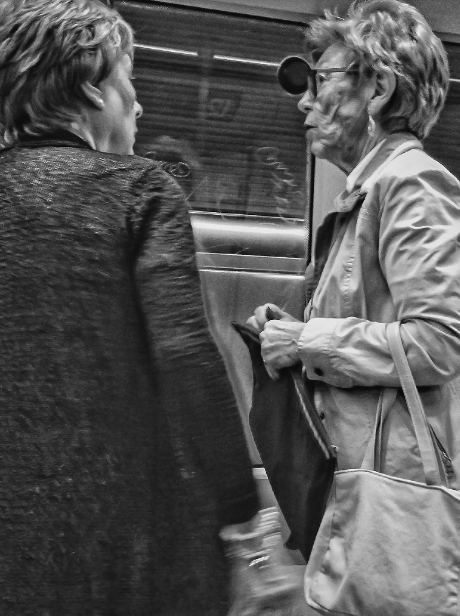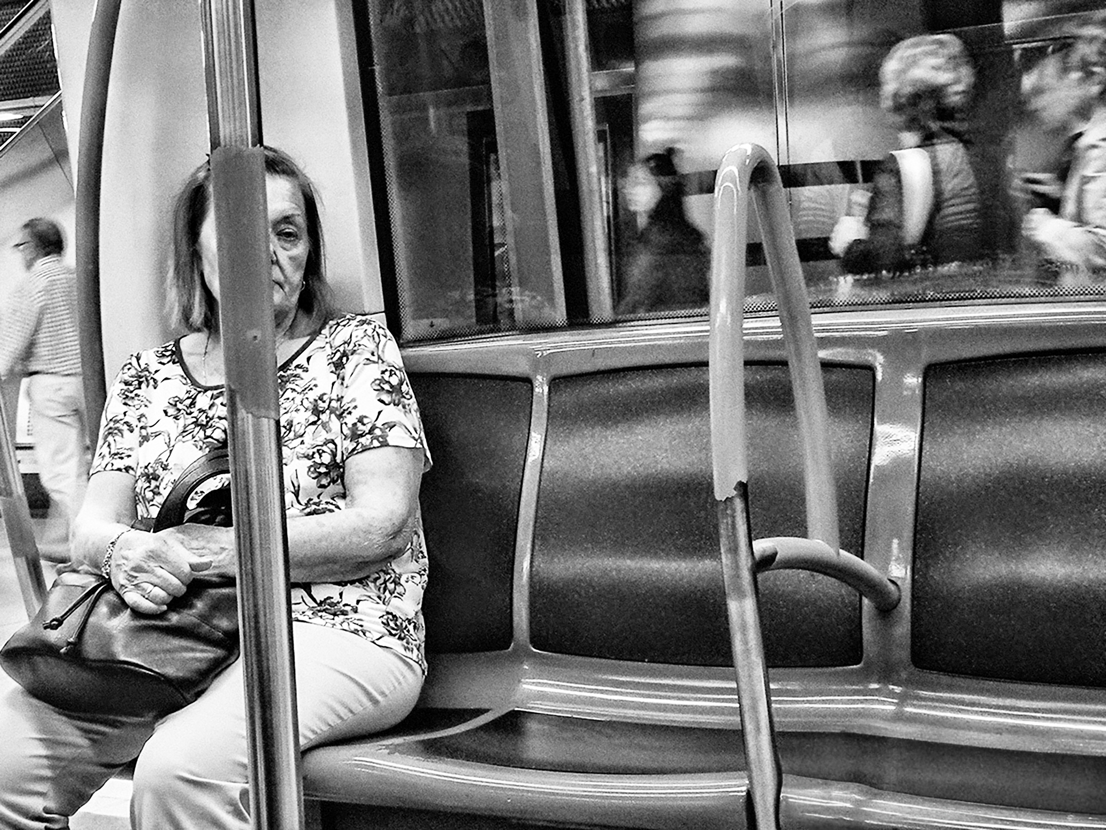 El perfil de la mujer de la derecha era impecable, casi esculpido, pero sus ojos miraban con atención durante la conversación, más allá del vagón, como si estuviera en un lugar donde se encuentra segura, pues va sin agarrarse a ningún sitio. A pesar de ello, había algo en su postura que hablaba de una alerta tenue, como si escuchara con un oído y con