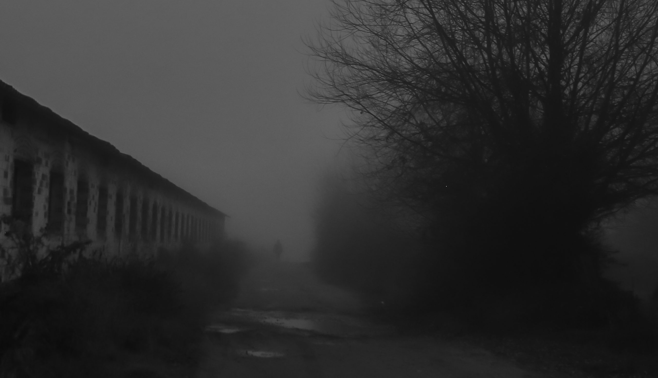 El eco de sus propios pasos se mezclaba con el crujido de las hojas bajo sus botas. A un lado, la tapia de los huertos del convento se extendía como un muro interminable; al otro, la fachada oscura del edificio se alzaba imponente. La niebla se acumulaba allí con mayor densidad, silenciando el mundo a su alrededor.